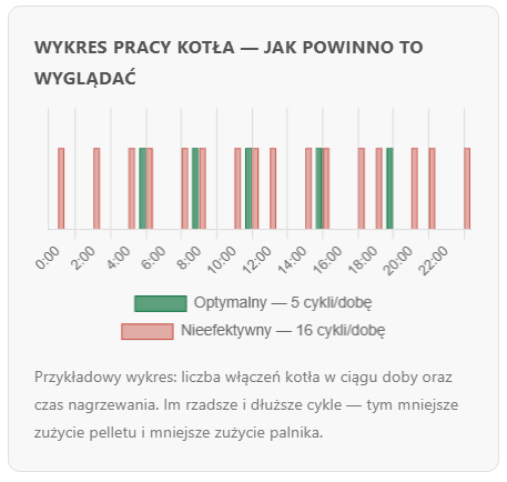 - Wydłużenie przerw między startami – kilka procent korekty potrafi przełożyć się na 10–20% mniej pelletu w miesiącach przejściowych.